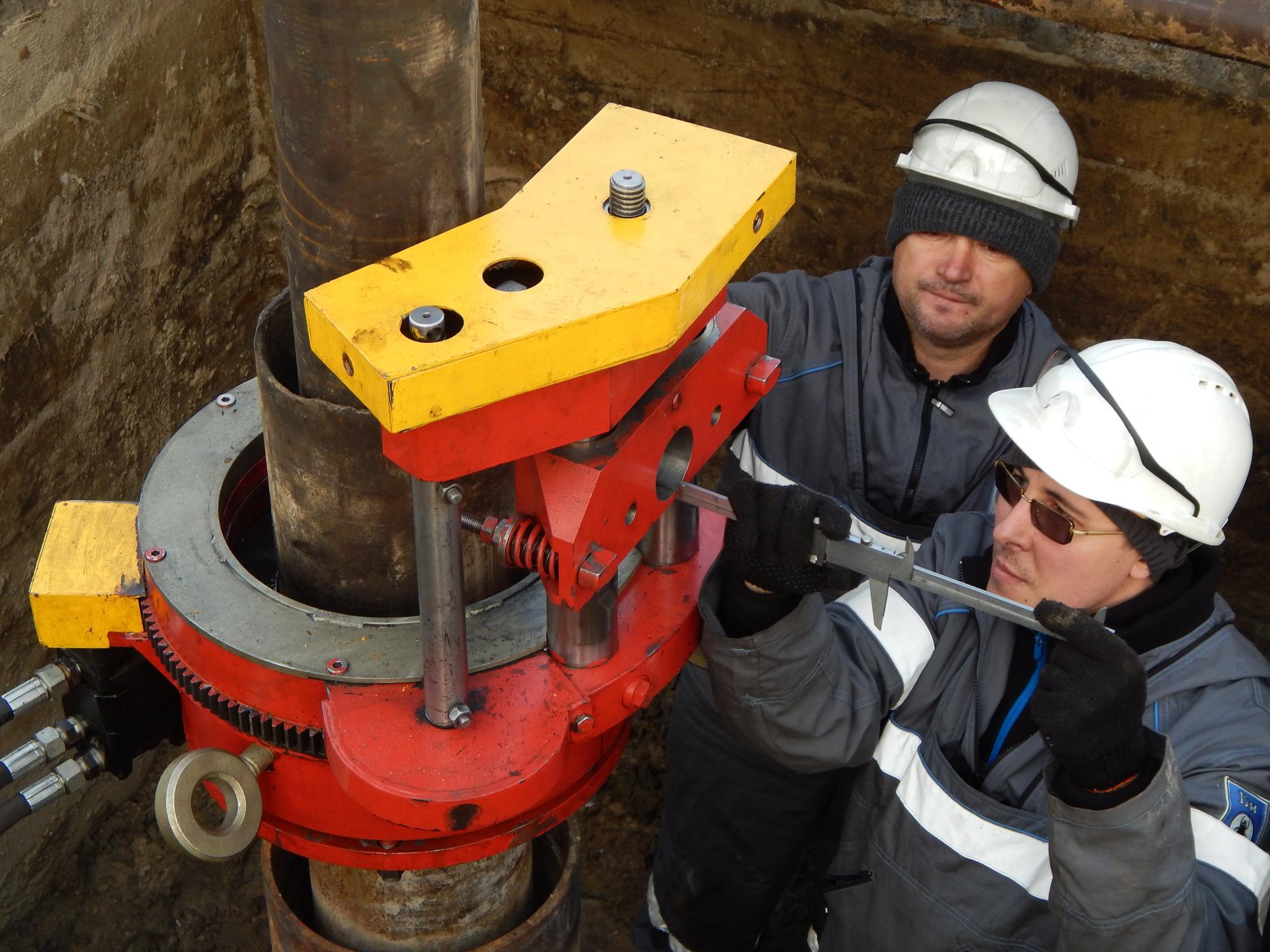 Работы включают в себя срез неисправного (ненадлежащего) устьевого оборудования, нарезание резьбы на трубе эксплуатационной колонны и кондуктора, подгонка высоты обсадных колонн под установку колонной головки с помощью патрубков и муфт, монтаж колонной головки.